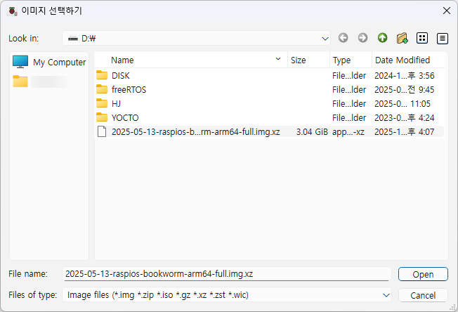 위에서 다운로드 받은 파일 선택(*.img.xz 압축 풀 필요 없음)