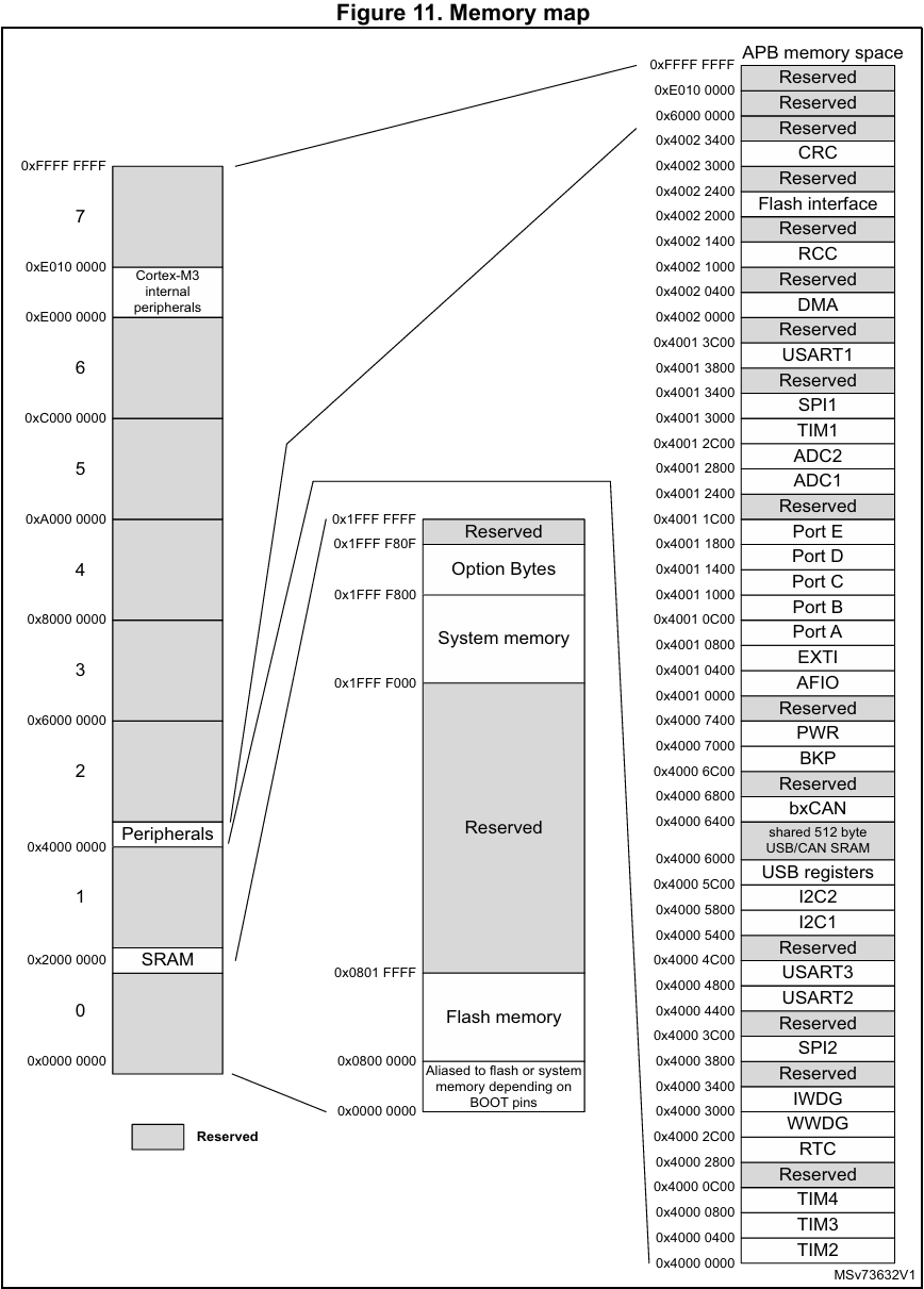 - STM32F103의 메모리 맵은 Cortex-M3 코어를 기반으로 설계된 마이크로컨트롤러의 주소 공간 구조