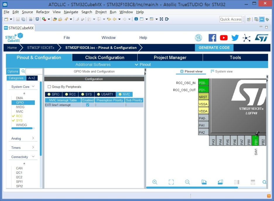 2) PB1을 Mouse 왼쪽 버튼 클릭하여 GPIO_EXTI1 선택