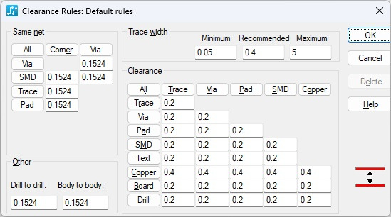 - Setup → Design Rules에서 패드 크기, 트랙 폭, 간격 등 디자인 규칙을 설정