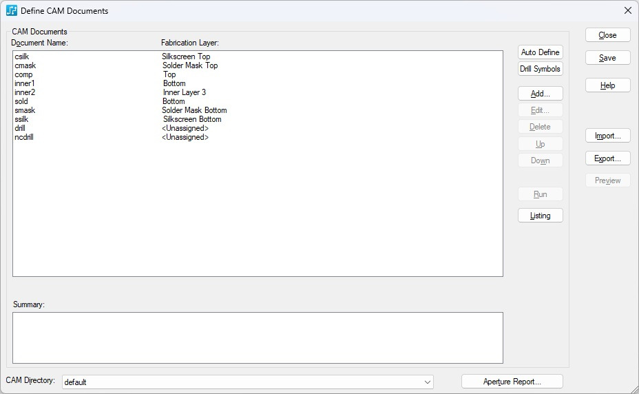 - 어떤 레이어를 어떤 방식으로 제작 데이터 생성 또는 출력할지 설정. 이를 통해 실제 PCB 제조용 데이터가 생성