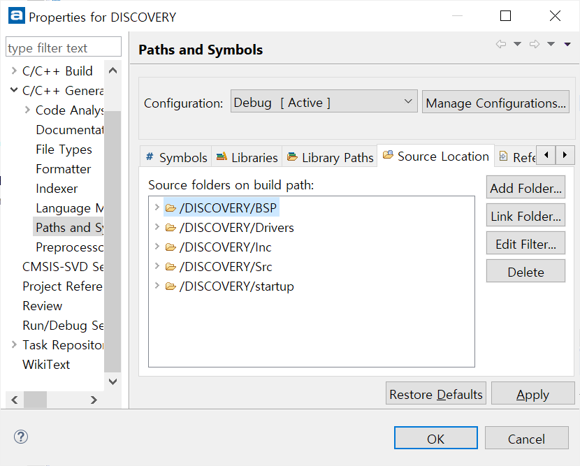 2) C/C++ General > Paths and Symbols > Source Location에 BSP 폴더 추가
