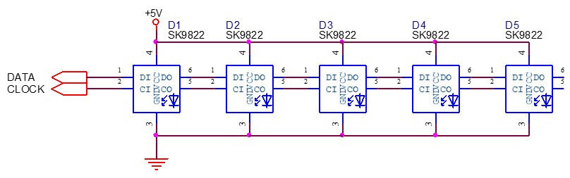 - SK9822는 two-wire 전송 채널 3(RGB) 구동 지능형 제어 회로 및 조명